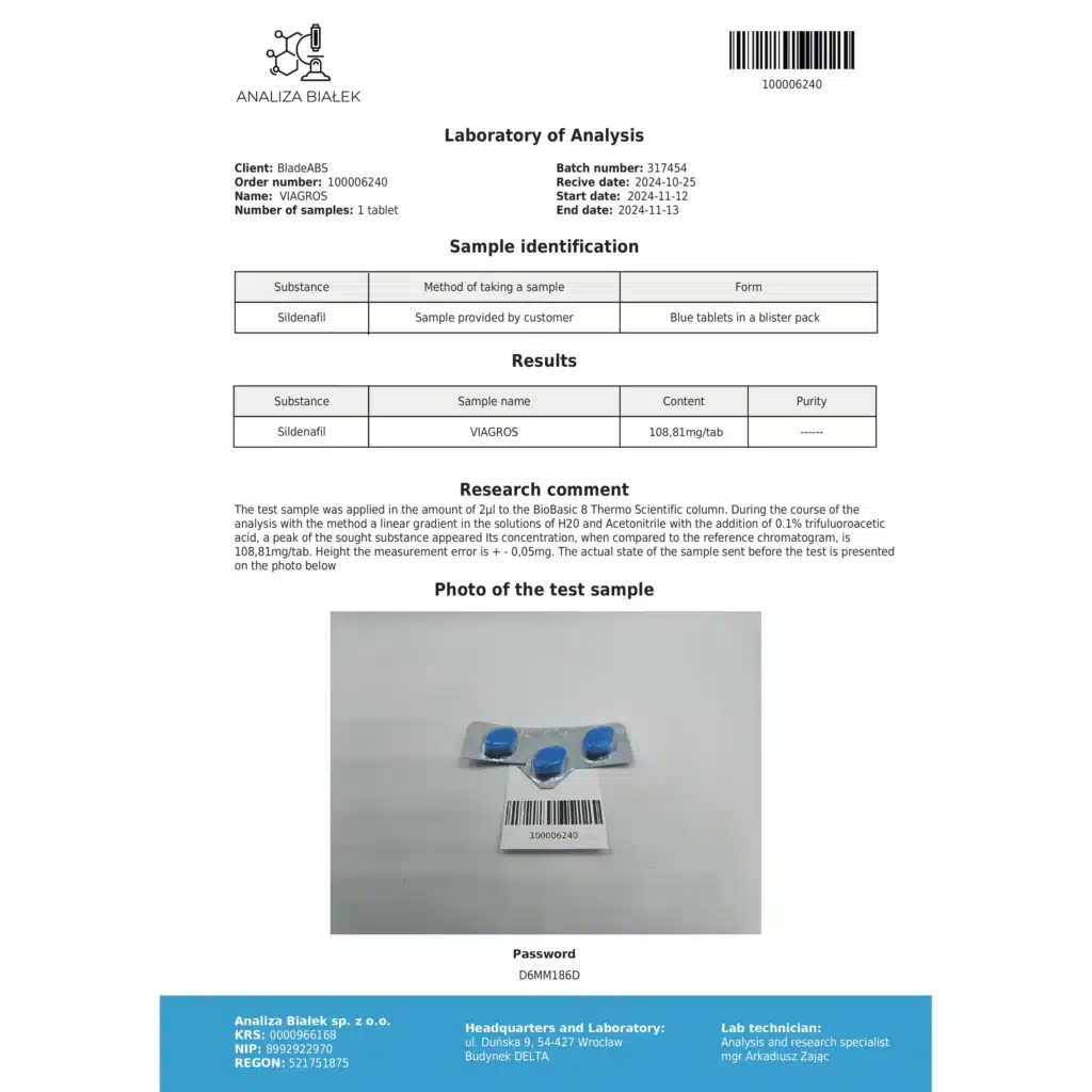 A Driada Medical nem állítja, hanem méri. Minden Viagros-tétel HPLC (magas teljesítményű folyadék-kromatográfia) teszten megy keresztül az athéni laborban. Ez a módszer 0,01%-os pontossággal szeparálja a hatóanyagot a szennyeződésektől. Eredmény: 99,7%-os tisztaság, ahol a maradék 0,3% segédanyag (mikrokristályos cellulóz, magnézium-sztearát). Egy független görög intézet (ELGO-DIMITRA) ellenőrizte: 0,0002% nehézfém, 0 CFU baktérium. Ez a precizitás teszi a Viagros-t a legjobb eladó viagra-vá: gyorsabb felszívódás (mikronizált 3 mikronos szemcsék), hosszabb hatás (stabil citrát-só), és nulla meglepetés.